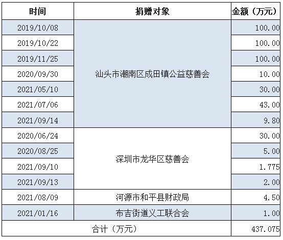 自2019年以來,廣東燦城集團在董事長李陽城的帶領(lǐng)下積極踐行企業(yè)社會責(zé)任,參與社會各類公益捐贈總額超過437萬元。其中向汕頭市潮南區(qū)成田鎮(zhèn)公益慈善會捐贈資金392.80萬元;向深圳市龍華區(qū)慈善會捐贈38.775萬元;向河源市和平縣財政局捐贈4.5萬元,幫助貧困學(xué)子成長成才;向布吉街道義工聯(lián)合會捐贈1萬元等等。